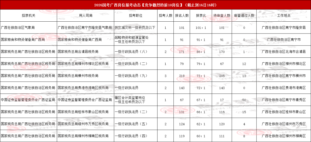 我們接著來看廣西地區(qū)國考報名競爭最激烈的前十職位匯總情況。當前,國家稅務總局廣西壯族自治區(qū)稅務局-國家稅務總局桂林市臨桂區(qū)稅務局的【一級行政執(zhí)法員(三)】 職位,以220人的報名數(shù)成為目前前十職位中最熱門的選擇。