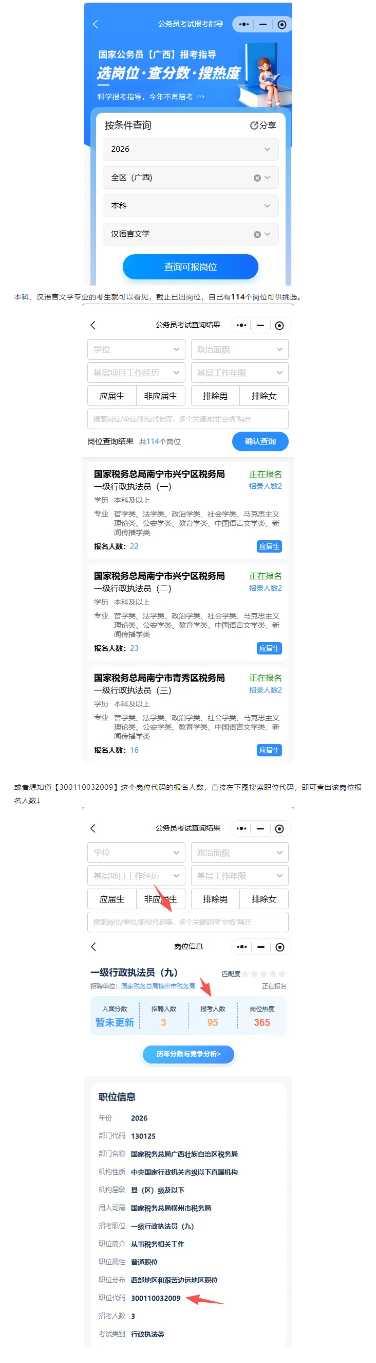 更多崗位報名詳細內容請使用公考天眼查詢,在這里,你能清晰查看各個崗位的官方報考人數(shù)、本系統(tǒng)崗位熱度,崗位報名條件,入面分數(shù)和錄取分數(shù),這些數(shù)據(jù)都是經過精準整理與分析的,能為你的選崗提供有力參考。