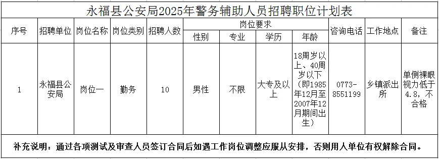(五)已通過永福縣公安機(jī)關(guān)組織的警務(wù)輔助人員招聘各項(xiàng)環(huán)節(jié),非因不可抗拒原因,放棄受聘資格的或聘用后未按要求到崗的,不得再次報(bào)考。