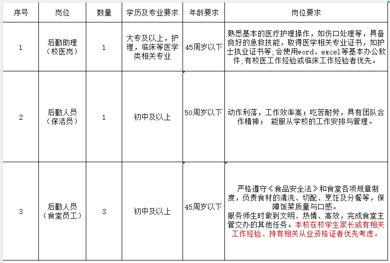 3.具有相應(yīng)崗位文化程度,身體健康、手腳敏捷、具有團(tuán)隊(duì)合作精神,能服從學(xué)校安排及管理。