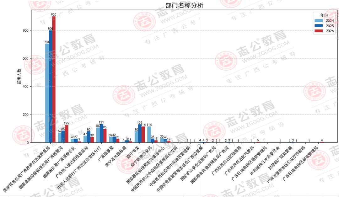 在今年,廣西國稅系統(tǒng)這個招考“大戶”,招錄漲到了900人,職位數(shù)占比66%。此外,國家金融監(jiān)督管理總局廣西監(jiān)管局招125人,呈正增長,與2025年國考相比漲幅47%。南寧海關從2025年招錄129人,2026年只招錄114人,相比縮減了11.63人。