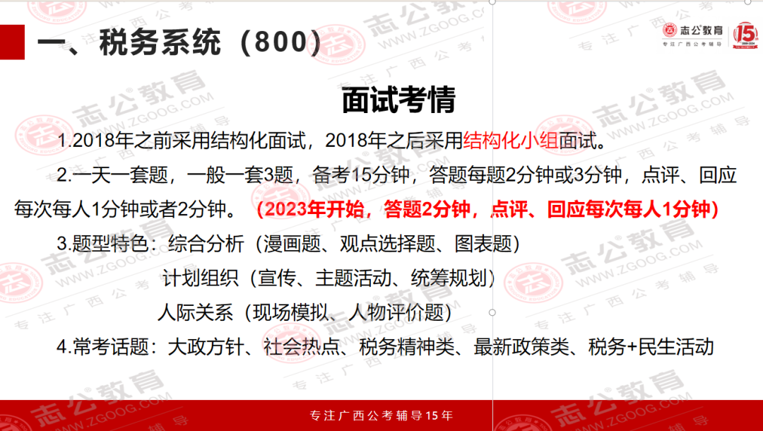 自2018年開始,稅務系統(tǒng)率先在結構化面試的基礎上,采用了一種新的面試形式——結構化小組面試。在這種模式下,題目的類型和結構化面試基本沒有區(qū)別,但是作答模式發(fā)生了改變。