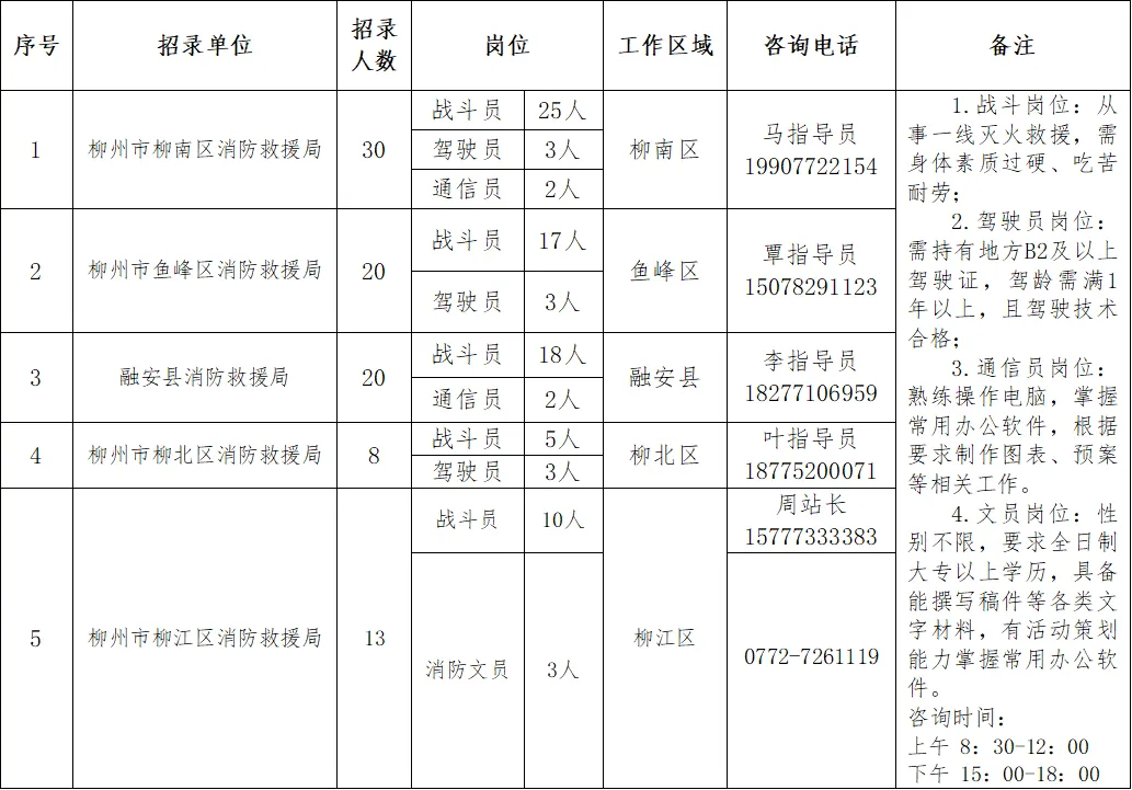 政府專職消防員91人。崗位要求:男性,身高165CM以上,雙眼裸視力4.8以上,需具備高中(中專)以上學歷,年齡為18-28周歲以下(有部隊服役經歷或者全日制大專及以上學歷可放寬至30周歲),身體素質過硬、吃苦耐勞、心理健康,無遺傳性、傳染性和慢性疾病,符合體檢標準。