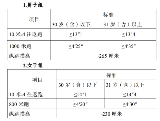 參照《關于印發(fā)<公安機關錄用人民警察體能測評項目和標準>的通知》(公政治〔2024〕60號)執(zhí)行,每個測評項目分別記錄成績。其中縱跳摸高的測評次數(shù)不超過3次,10米×4往返跑測評次數(shù)不超過2次,男子1000米跑、女子800米跑測評次數(shù)均為1次。