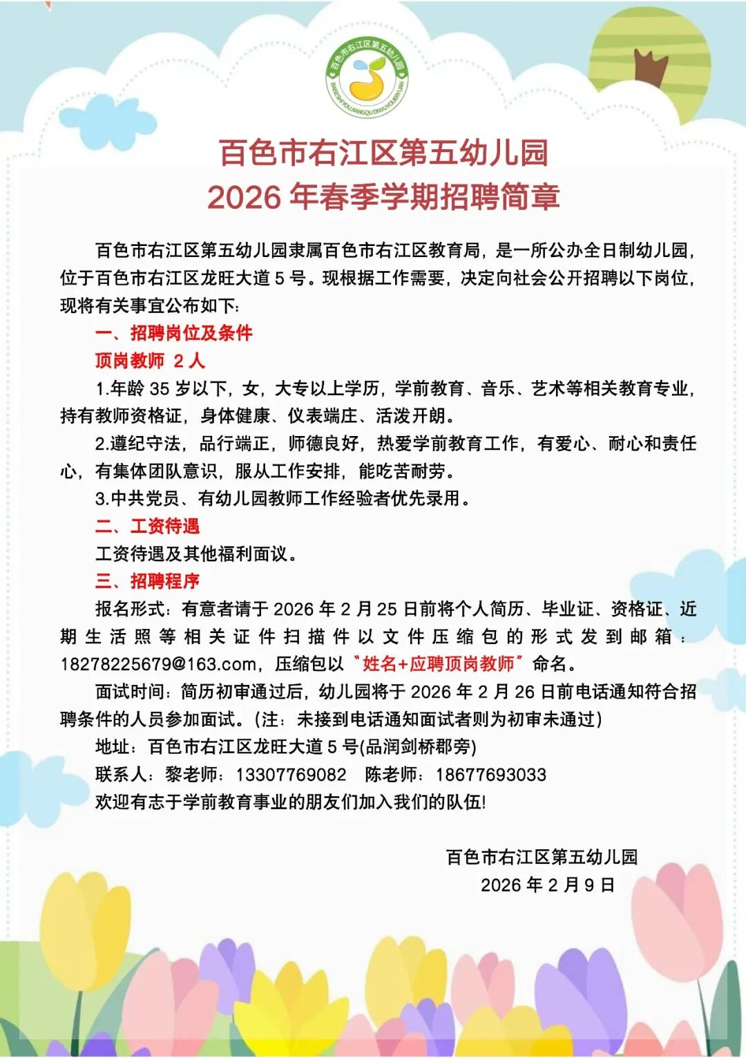 2026年春季學(xué)期百色市右江區(qū)第五幼兒園招聘2人