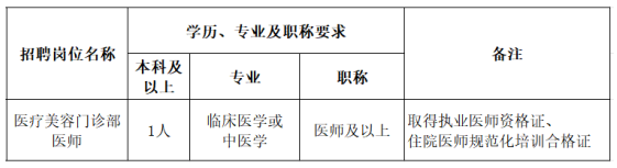 根據(jù)醫(yī)院發(fā)展需要,現(xiàn)面向社會(huì)招聘醫(yī)療美容門(mén)診部醫(yī)師,有關(guān)招聘事項(xiàng)公告如下: