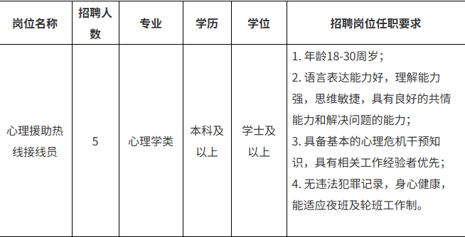 醫(yī)院承接“12356全國統(tǒng)一心理援助熱線”,提供24小時不間斷服務(wù)模式,由專職心理咨詢師、心理治療師及精神科醫(yī)護人員組成專業(yè)團隊,為來電者提供心理教育、心理咨詢、危機干預(yù)及心理健康科普服務(wù),覆蓋情緒舒緩、家庭關(guān)系、青少年心理咨詢等多類問題,為自殺高危人群提供快速響應(yīng)與轉(zhuǎn)介服務(wù)。為進一步提升心理服務(wù)質(zhì)量、補充現(xiàn)有接線員力量,為公眾提供更優(yōu)質(zhì)、專業(yè)、高效的心理健康服務(wù),現(xiàn)面向社會招聘5名接線員。