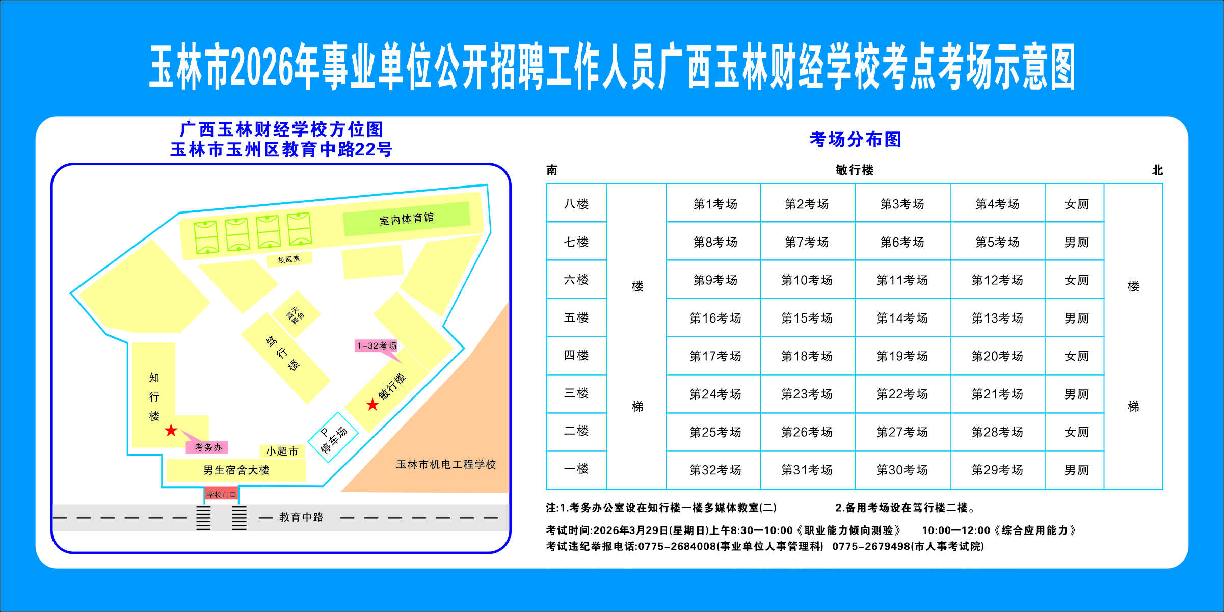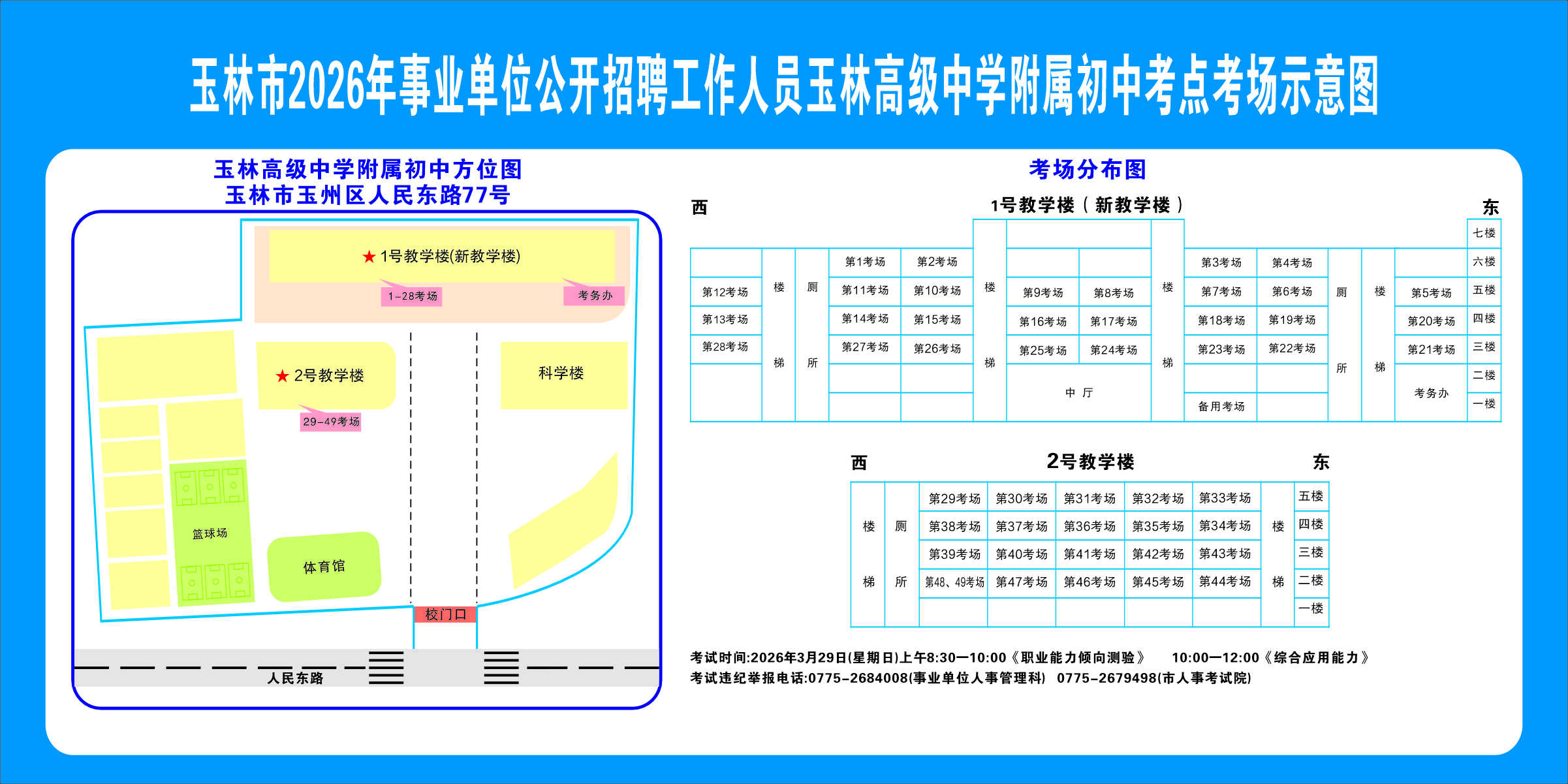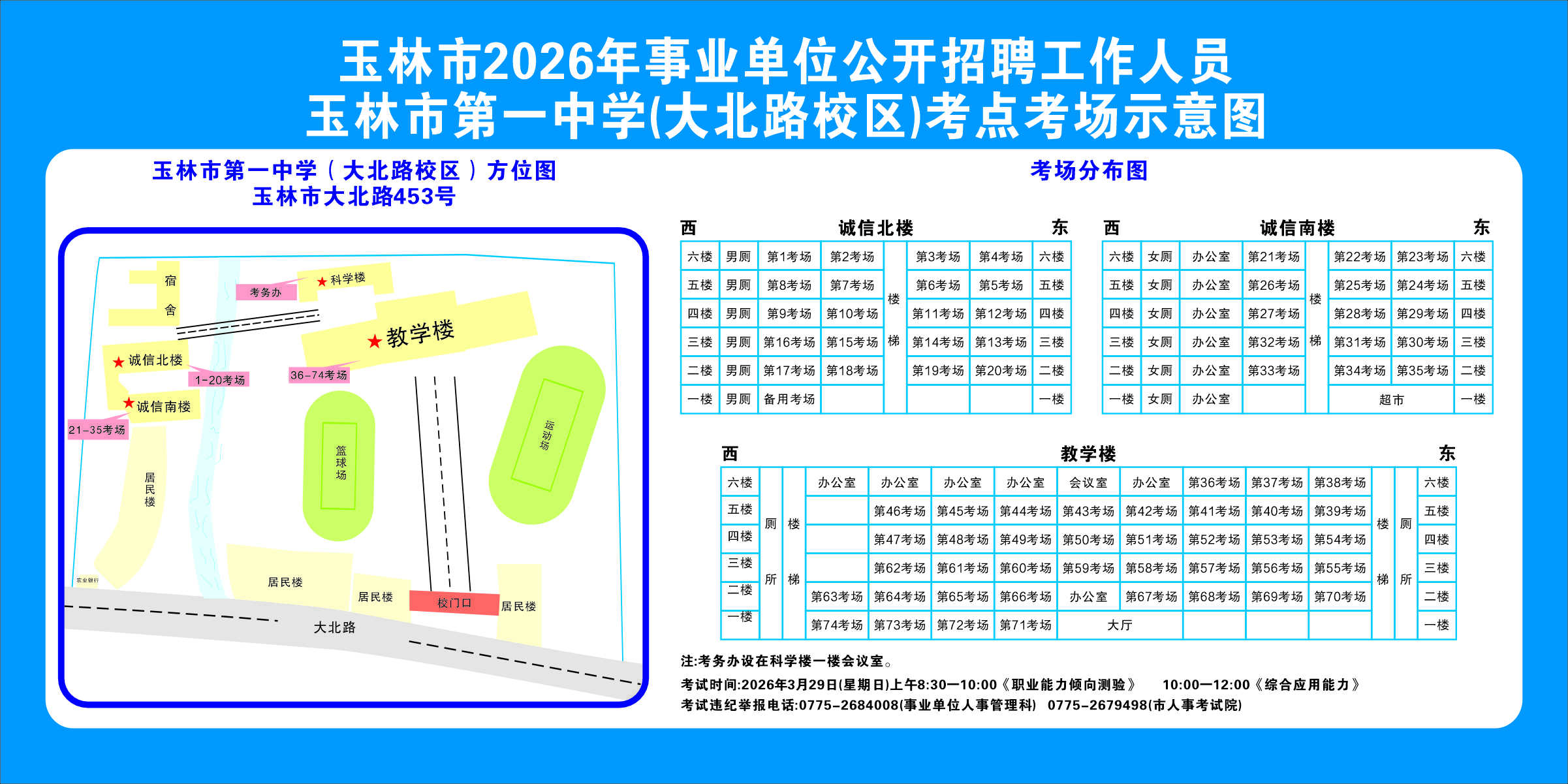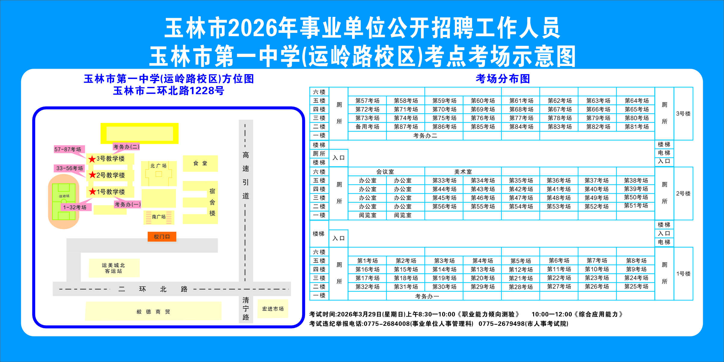 2.需要特別注意的是:玉林市第一職業(yè)中等專業(yè)學??键c是設在該校的東校區(qū)(人民東路東235號);玉林市第一中學考點分為運嶺路校區(qū)(二環(huán)北路1228號)、大北路校區(qū)(大北路453號)。