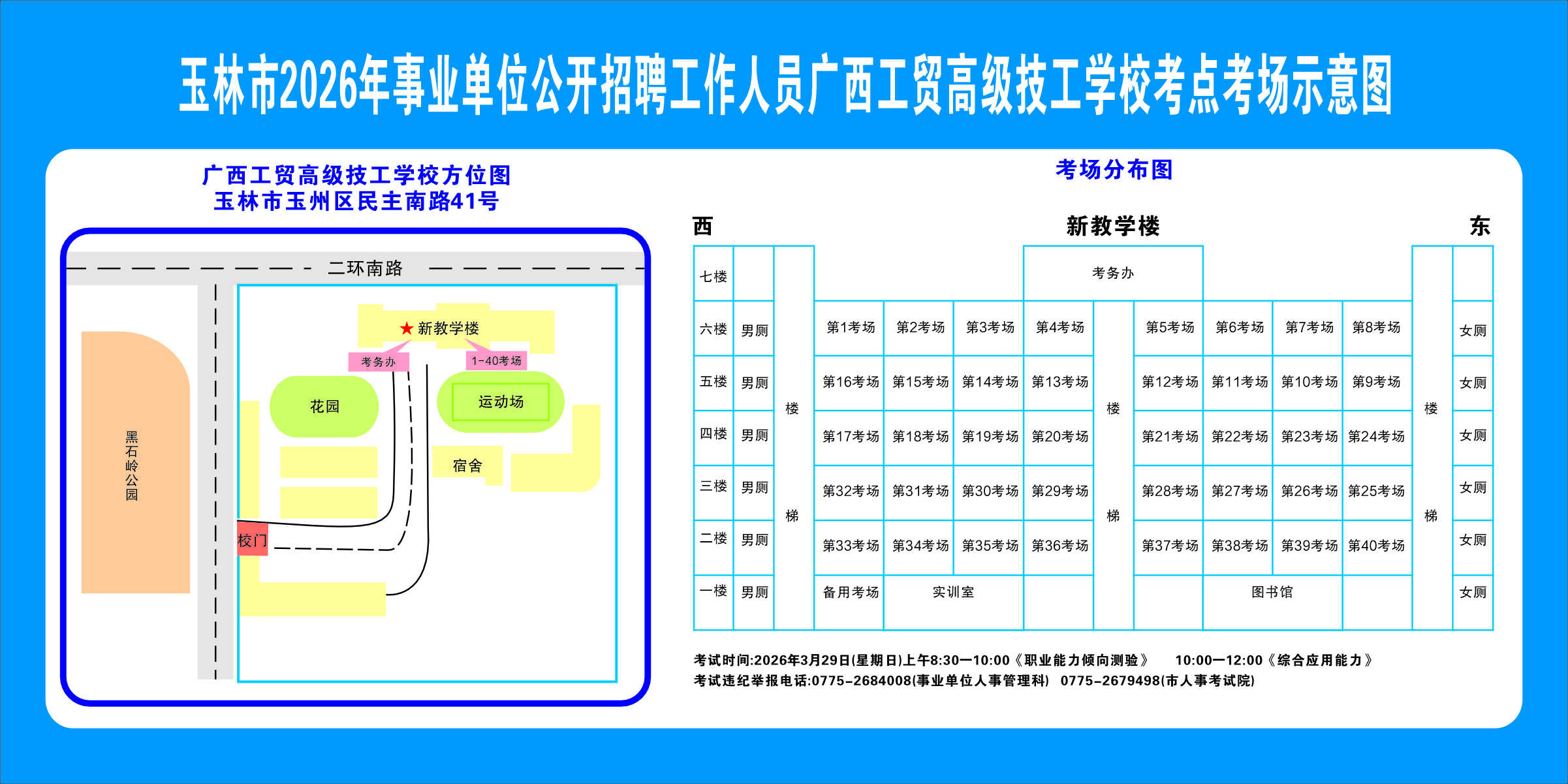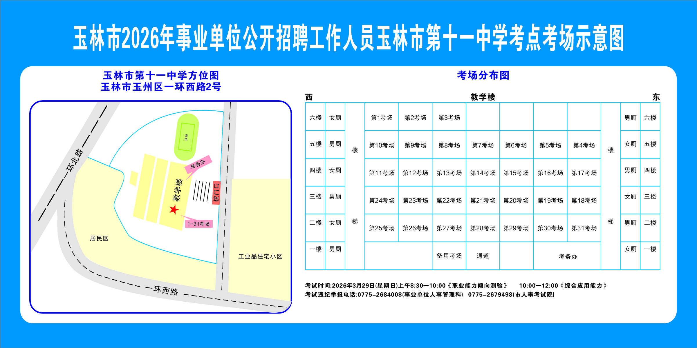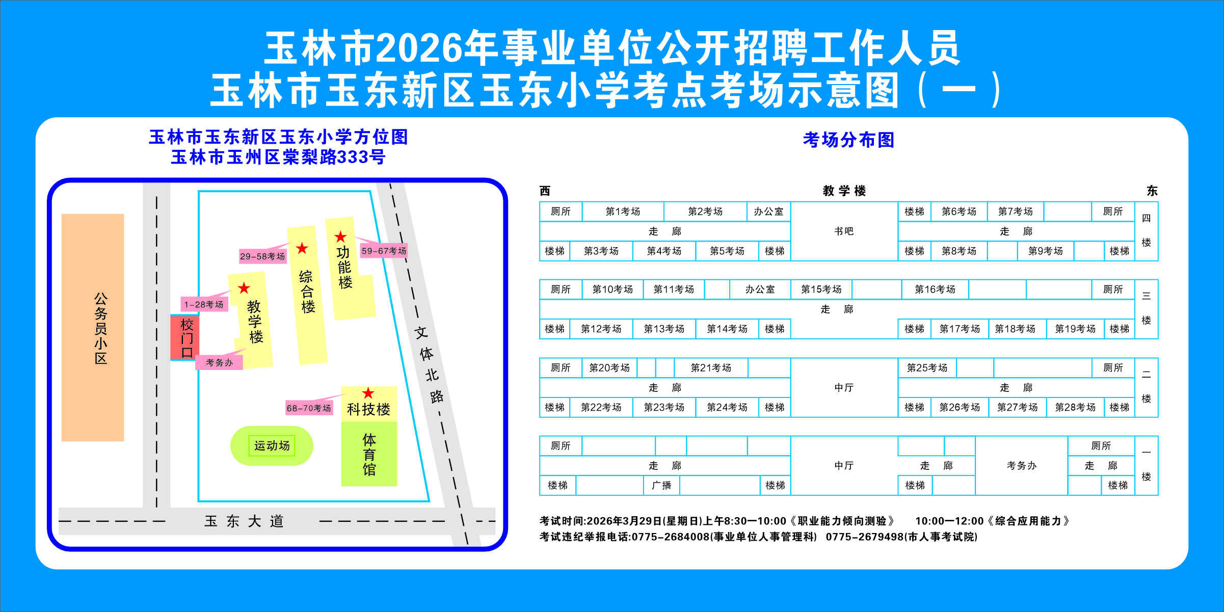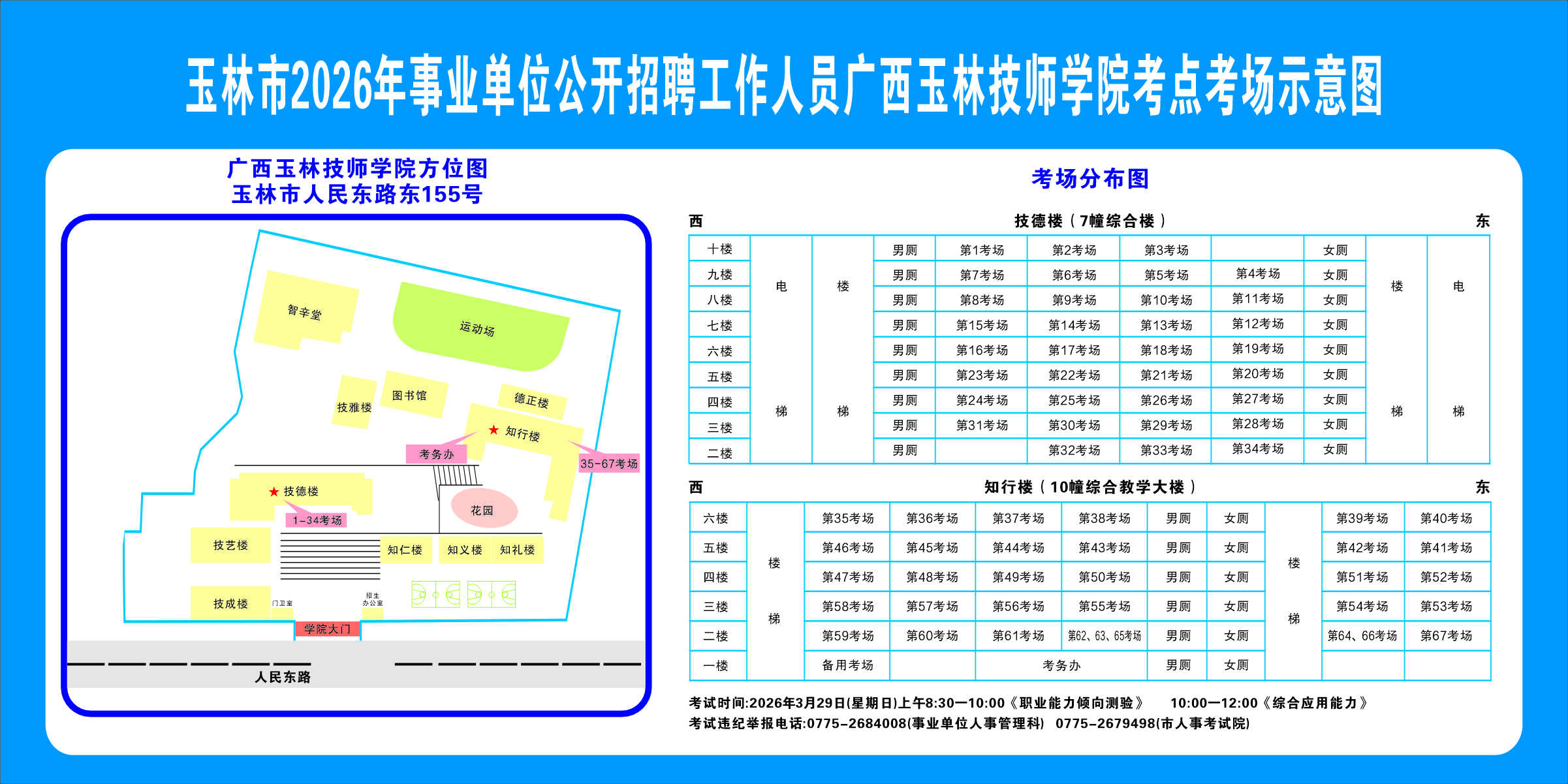 2.需要特別注意的是:玉林市第一職業(yè)中等專業(yè)學??键c是設在該校的東校區(qū)(人民東路東235號);玉林市第一中學考點分為運嶺路校區(qū)(二環(huán)北路1228號)、大北路校區(qū)(大北路453號)。