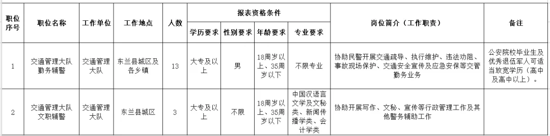 東蘭縣公安局本次擬招聘警務輔助人員16人,具體招聘崗位、人數(shù)、資格條件詳見《東蘭縣公安局2026年上半年公開招聘警務輔助人員崗位設置表》(附件1)