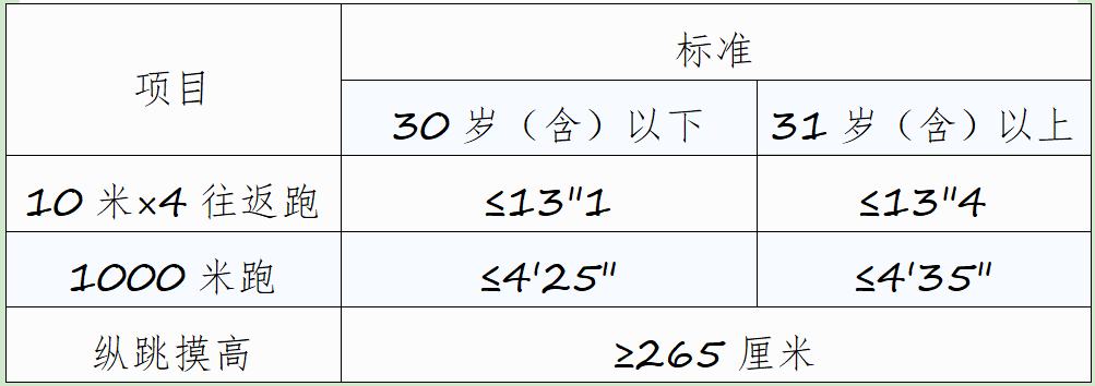 年齡計(jì)算時(shí)間截止到參加體能測評(píng)當(dāng)月。體能測評(píng)項(xiàng)目中,10米×4往返跑項(xiàng)目每人最多可測2次,男子1000米跑(女子800米跑)項(xiàng)目每人最多可測1次,縱跳摸高項(xiàng)目每人最多可測3次。1次測評(píng)達(dá)標(biāo),即視為該項(xiàng)目測評(píng)合格。體能測評(píng)所需的場地環(huán)境和器材,結(jié)合測評(píng)地點(diǎn)的實(shí)際情況設(shè)置。