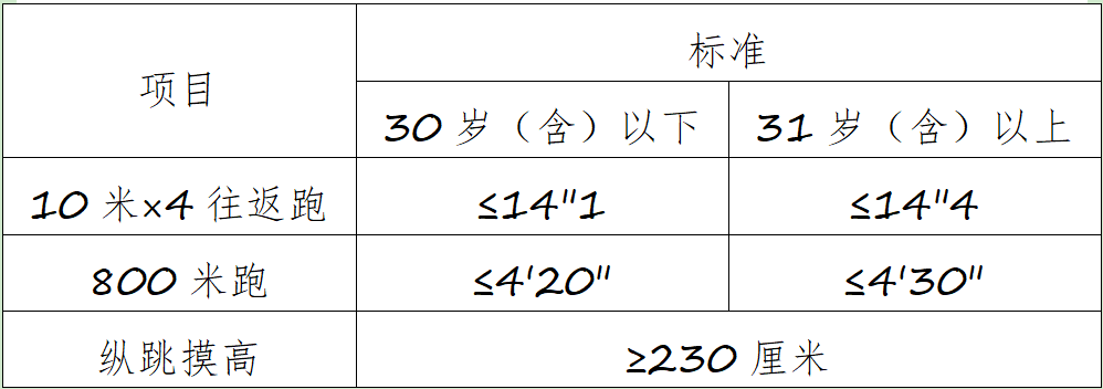 按照《公安機(jī)關(guān)錄用人民警察體能測評(píng)項(xiàng)目和標(biāo)準(zhǔn)》(公政治〔2024〕60號(hào))執(zhí)行。體能測評(píng)項(xiàng)目包括10米×4往返跑、1000米(男)/800米(女)跑和縱跳摸高3個(gè)項(xiàng)目,其中綜合管理類、執(zhí)法勤務(wù)類職位測查全部3個(gè)項(xiàng)目,警務(wù)技術(shù)類職位免予測查1000米(男)/800米(女)跑項(xiàng)目;對于專業(yè)人才緊缺難以形成競爭的特殊職位(緊缺職位),報(bào)考人員需在參加體能測評(píng)前,從3項(xiàng)體能測評(píng)項(xiàng)目中選擇2項(xiàng)參加測試。凡應(yīng)測項(xiàng)目中任意一項(xiàng)不達(dá)標(biāo)的,即為體能測評(píng)不合格。標(biāo)準(zhǔn)如下: