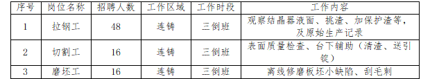 1、愿意從事鋼鐵生產(chǎn)作業(yè)工作,初中畢業(yè)及以上,年齡18-45歲,身體健康,無(wú)職業(yè)禁忌;